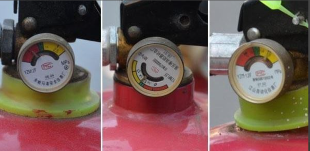 1.經常檢查滅火器壓力閥,指針應指在綠色區域,紅色區域代表壓力不足,黃色代表壓力過高。